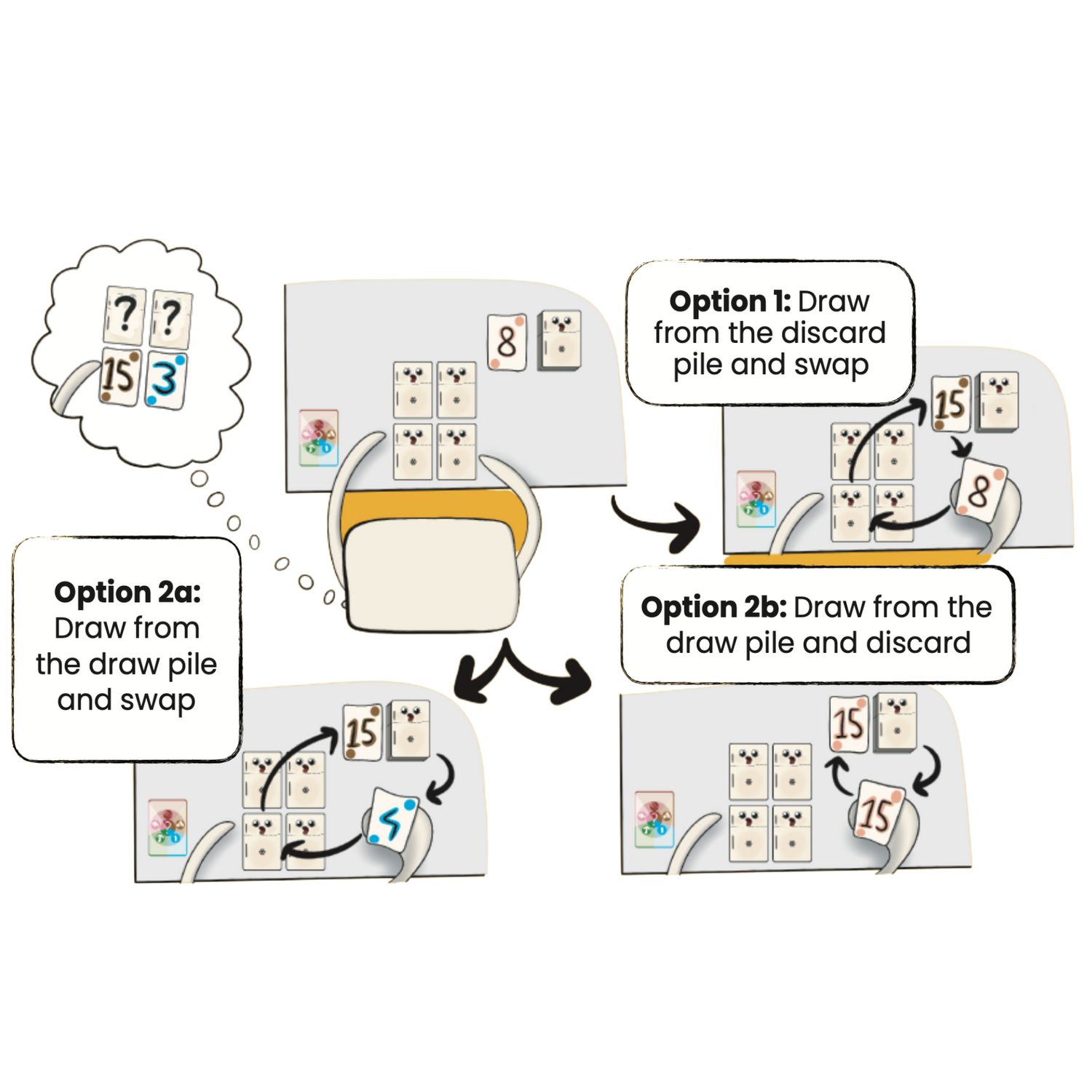 Het doel is om het spel te eindigen met het laagste aantal punten op je koelkastkaarten. Begin het spel met 4 koelkastkaarten met de afbeelding naar beneden. Kijk alleen naar de dichtstbijzijnde twee en onthoud ze. Speel nu het spel door om de beurt een koelkastkaart te trekken. Verwissel de getrokken koelkastkaart met een van je kaarten op tafel, of leg hem direct af. Kaarten blijven gesloten, dus blijf koel en houd je focus! De opties wanneer je aan de beurt bent: