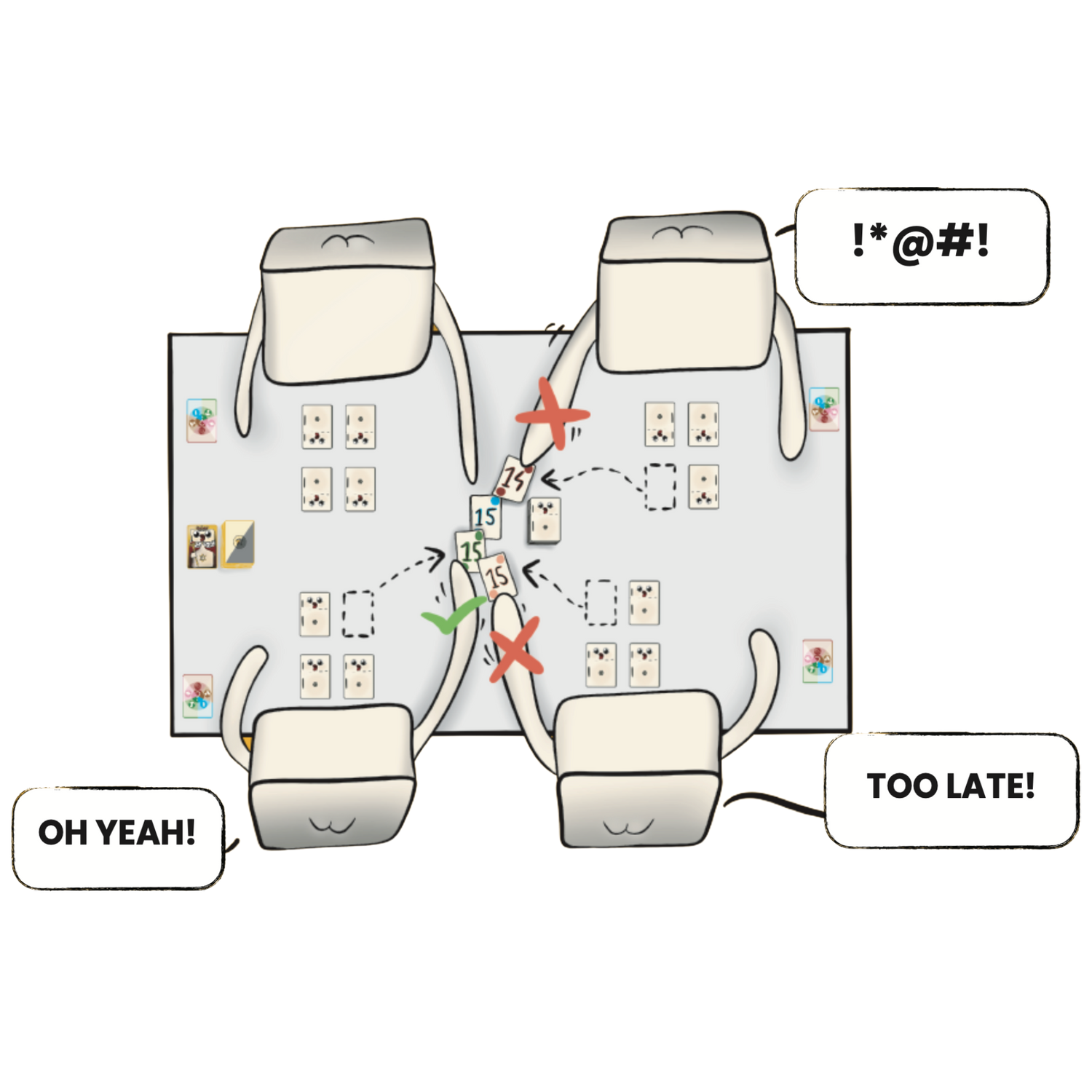 Houd een oogje in het zeil om je koelkastkaarten kwijt te raken als iemand een kaart weggooit die overeenkomt met die van jou. Wees er snel bij, want er mag maar 1 speler een kaart dumpen. Ben je te traag, dan heb je pech!